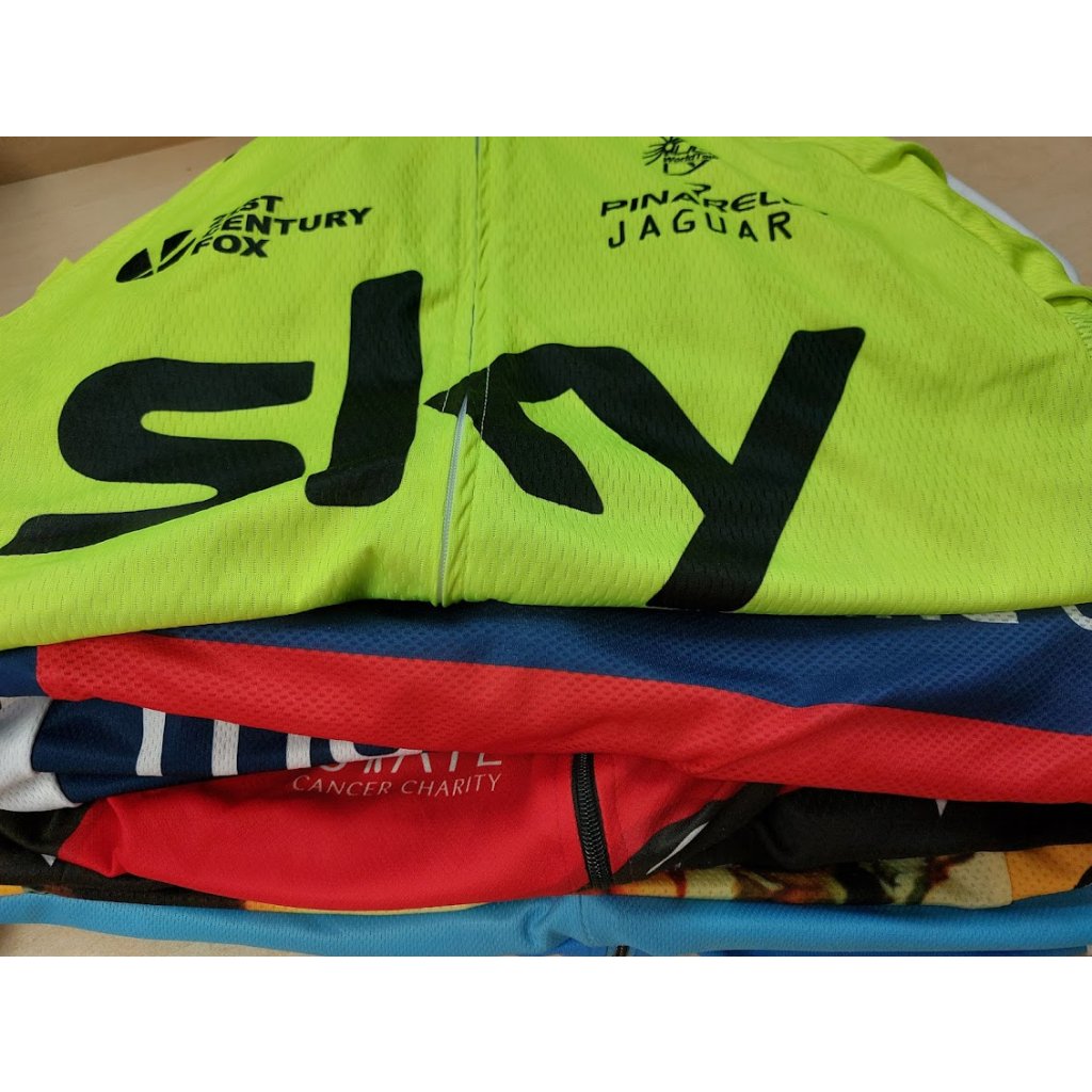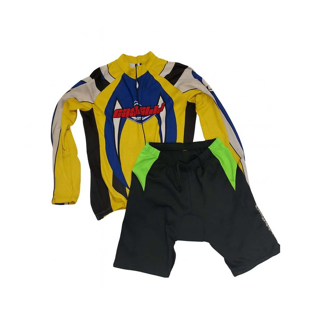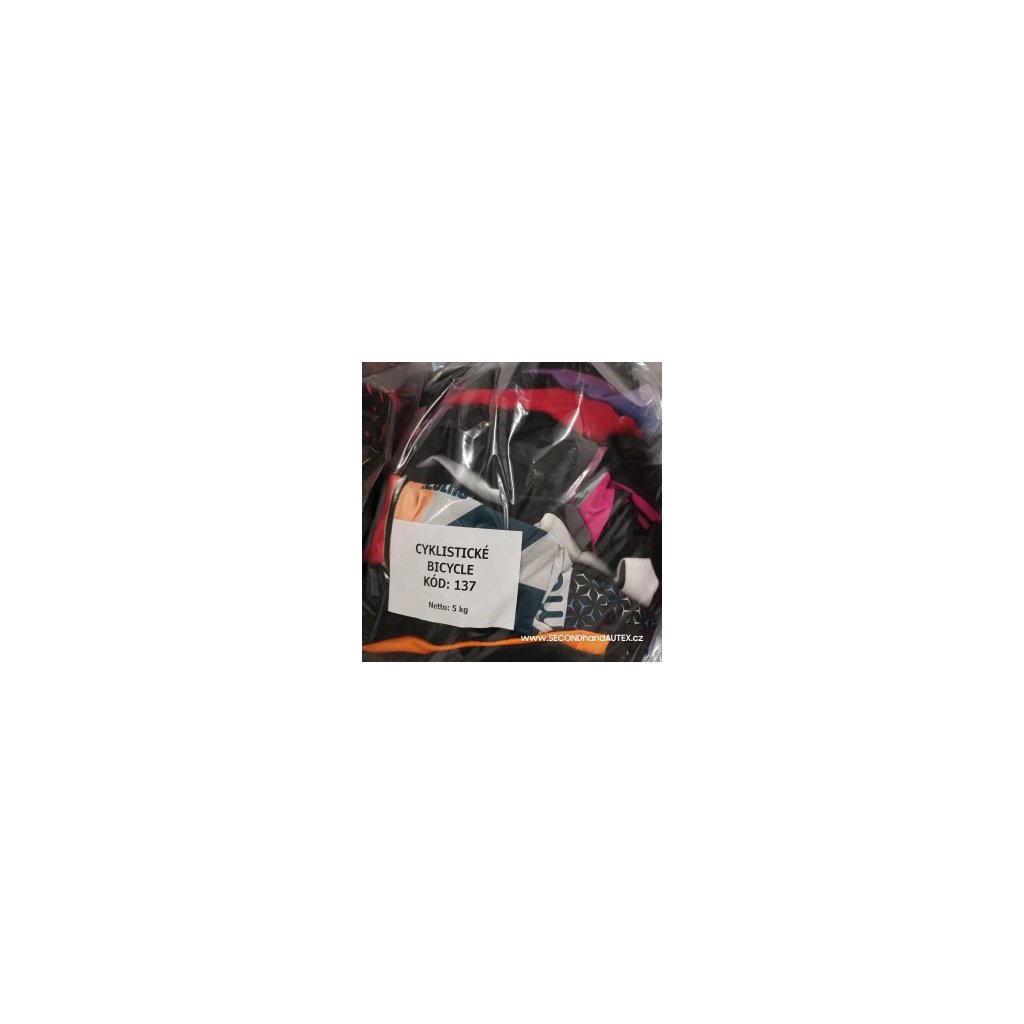Mix cyklistického oblečení. Převažují kalhoty a dresy (ty jsou s logem či bez) kvalita - využitelné, I. jakost a standard