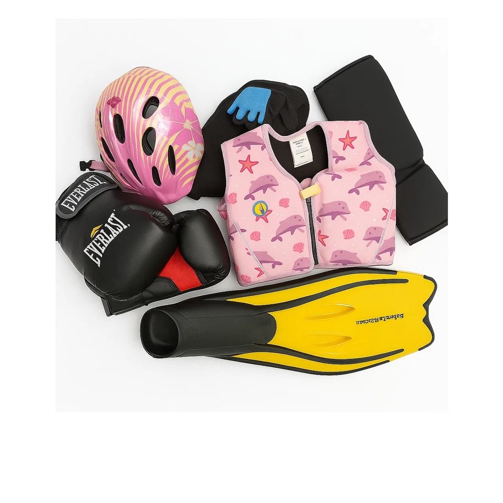 Přilby všeho druhu, chrániče aj. sportovní a ochranné pomůcky
